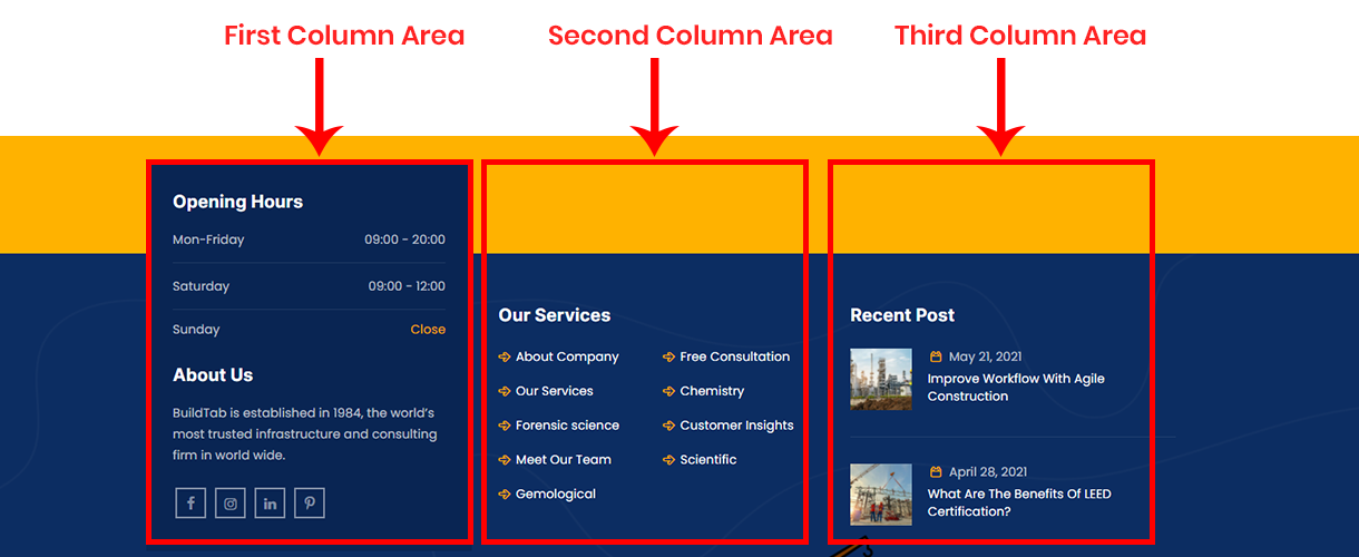 - First Footer - 1st Widget Area: This will be shown as 1st column in 1st row of footer area. You can set how many columns you like to show from "Buildtab Options > Footer Settings" section.