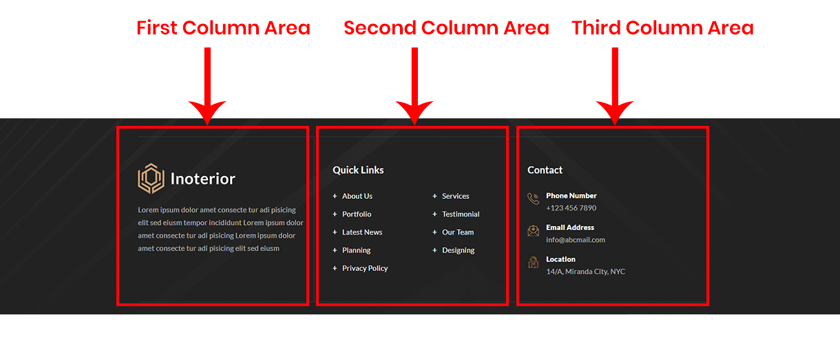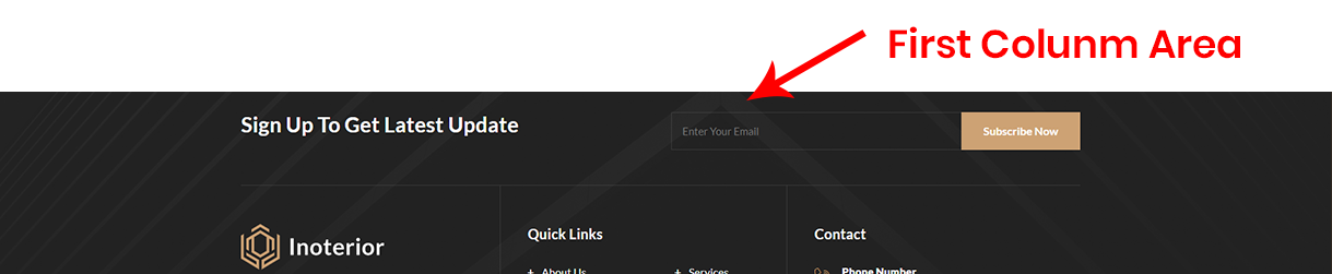 - First Footer - 1st Widget Area: This will be shown as 1st column in 1st row of footer area. You can set how many columns you like to show from "Inoterior Options > Footer Settings" section.