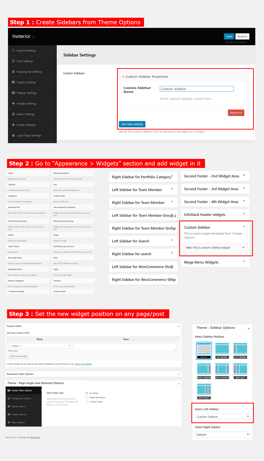- Left Sidebar For Pages: You can add Widgets that you want to display as Left sidebar for pages that you created using Pages section.